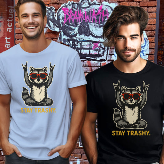 Stay Trashy Alpha Mens T-Shirt With A Rocking Raccoon