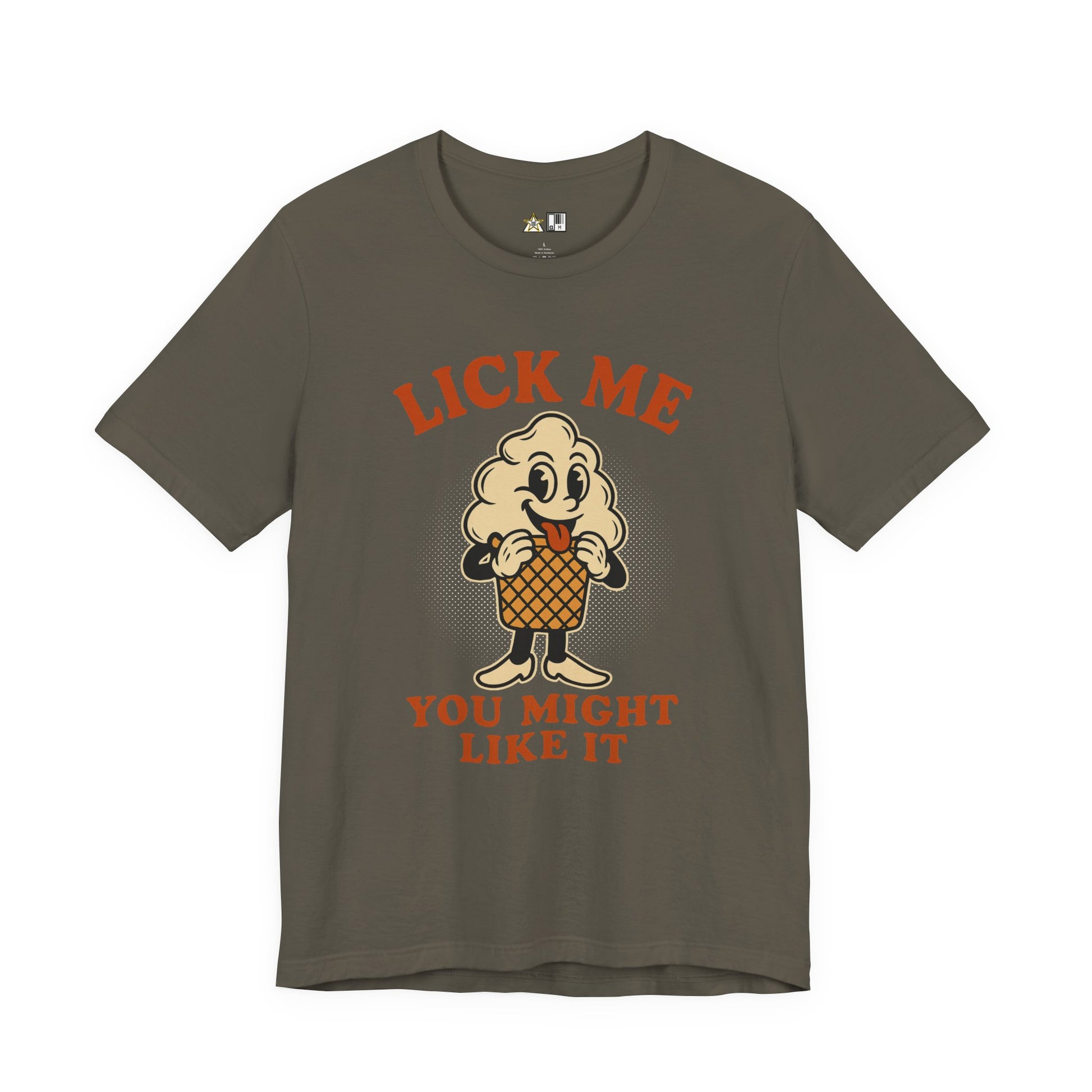 This graphic hits with unapologetic humor, featuring a retro-style melting ice cream character licking a cone with a mischievous grin, framed by bold halftone textures and warm vintage tones that instantly grab attention. The message “LICK ME YOU MIGHT LIKE IT” is loud, playful, and dominant, delivered with just enough edge to make people look twice without crossing the line. This tee isn’t asking for approval—it owns the room with confidence and irony, turning a cheeky visual into a statement of presence. Designed for those who enjoy controlled provocation, it balances humor and attitude in a way that feels effortless and self-assured. The fabric feels smooth and comfortable on the skin while staying tough enough for everyday wear, whether you’re moving from the gym to the street or out late with friends. Style it with jeans, cargos, joggers, or under a hoodie or jacket to keep the look sharp and intentional. This is not a novelty piece—it’s a bold streetwear t-shirt made for people who enjoy standing out and leaning into their edge without explaining themselves.