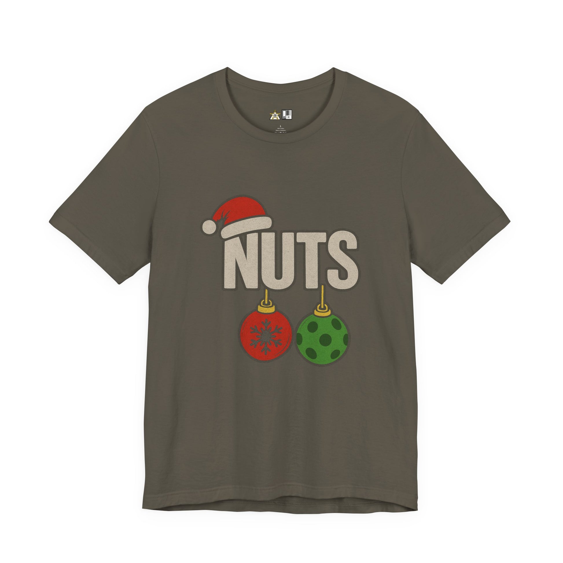 This design keeps it simple and savage: the word "NUTS" topped with a Santa hat, finished with two oversized holiday ornaments hanging loud and proud. It’s clean Christmas humor with a sharp edge—nothing forced, nothing explained. The joke lands instantly, mixing festive visuals with unapologetic confidence and a quiet “you know exactly what this means” energy.