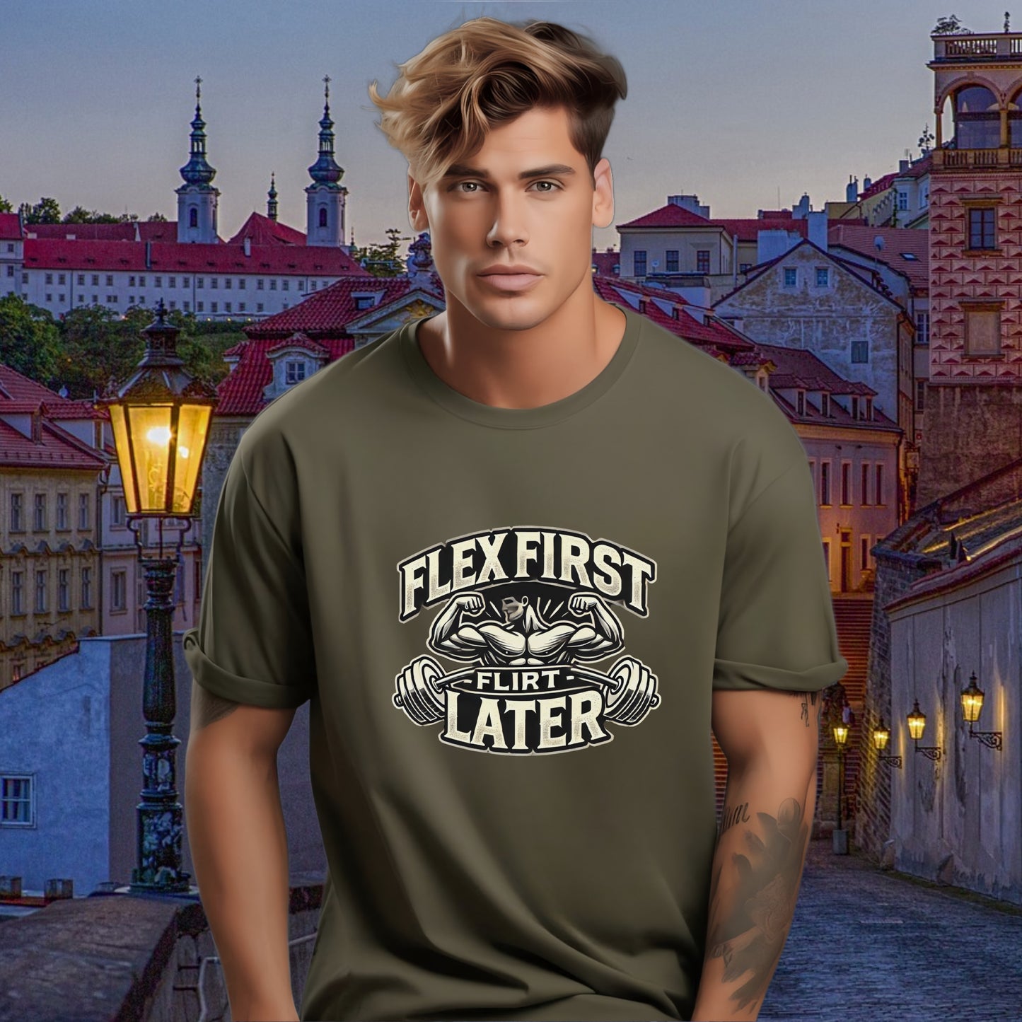 Dominate the gym then conquer desire with this Flex First Flirt Later T-Shirt. Unleash your inner alpha; muscles before flirting. Command respect and attract attention.