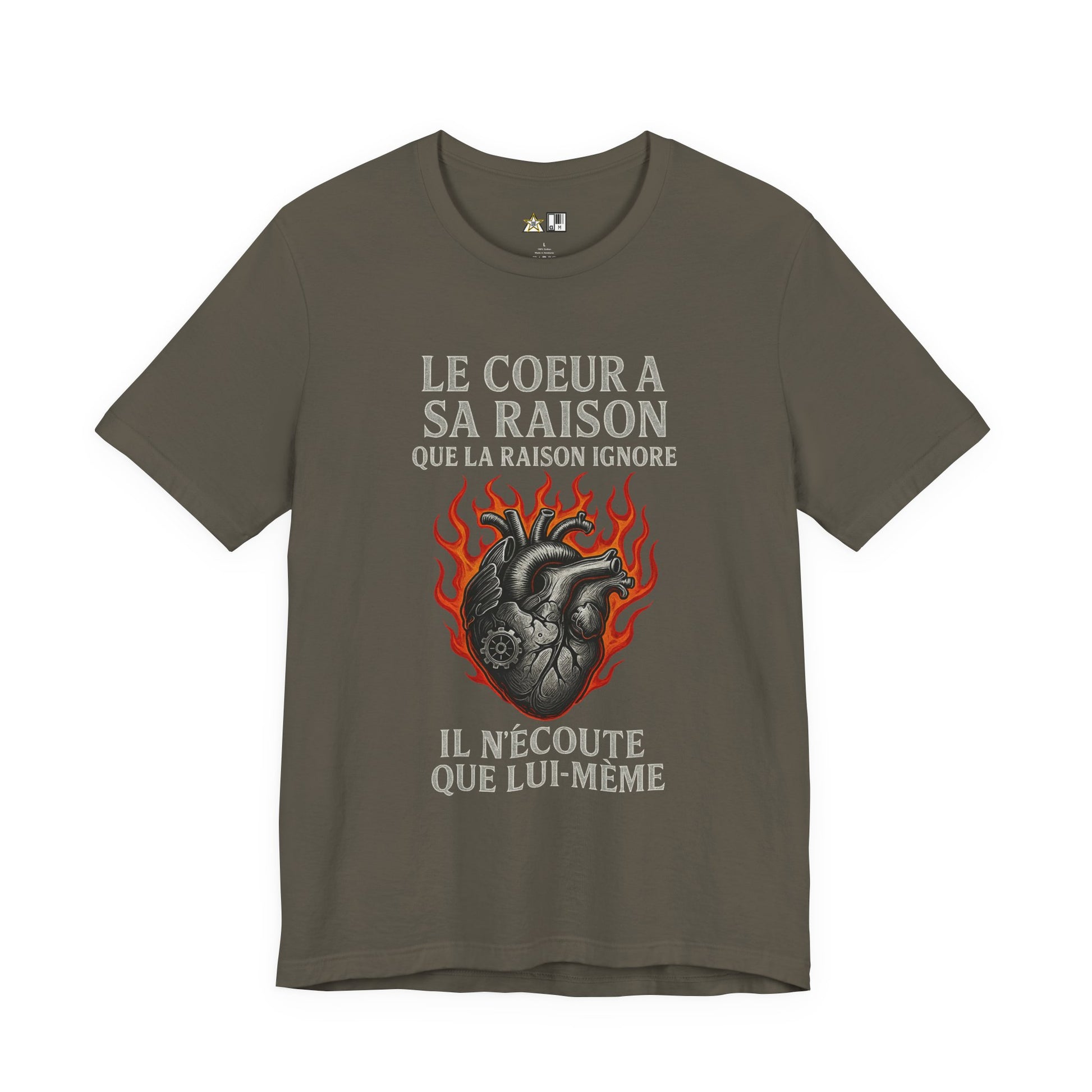 This unisex streetwear graphic tee features a burning anatomical heart wrapped in flames, raw and mechanical, symbolizing instinct over logic and inner fire over external noise. The message appears clearly and unapologetically in French: “LE CŒUR A SA RAISON QUE LA RAISON IGNORE” and “IL N’ÉCOUTE QUE LUI-MÊME”, turning this piece into a statement of self-trust and personal authority. The detailed illustration blends flesh, steel, and fire, creating a dark, powerful visual that feels driven, relentless, and emotionally charged. This tee isn’t about balance or calm — it’s about choosing instinct when hesitation fades. Soft to the touch but visually aggressive, it’s built for everyday wear without losing impact. Pair it with black jeans, cargos, combat boots, or layer it under a leather jacket, bomber, or heavy hoodie for a dominant gym-to-street look. This is an attitude piece for those who move forward without asking permission.