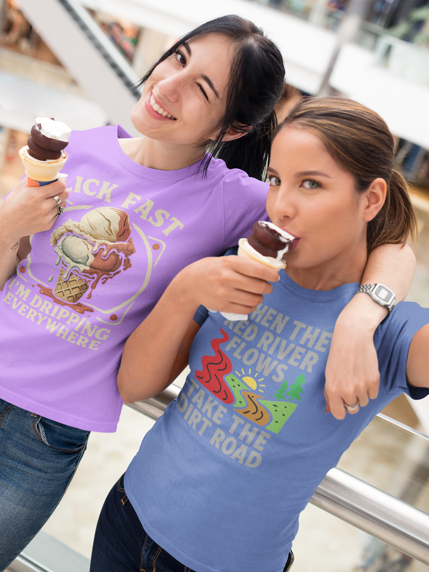 This unisex streetwear graphic tee turns playful chaos into a bold visual statement. The artwork features a dripping, stacked ice cream cone melting unapologetically means while the text “LICK FAST I’M DRIPPING EVERYWHERE” delivers a cheeky, confident punch that hits twice if you’re paying attention. It’s funny, provocative, and deliberately messy—just like confidence that doesn’t wait for permission. This tee isn’t subtle, it’s flirtatious energy with a grin, built for people who own the moment and enjoy the reaction. Soft, comfortable, and made for movement, it fits perfectly into a gym-to-street lifestyle where attitude matters as much as style. Pair it with jeans, cargos, joggers, or throw it under a hoodie or jacket to balance humor with edge. This is a statement tee for those who know exactly what they’re doing.
