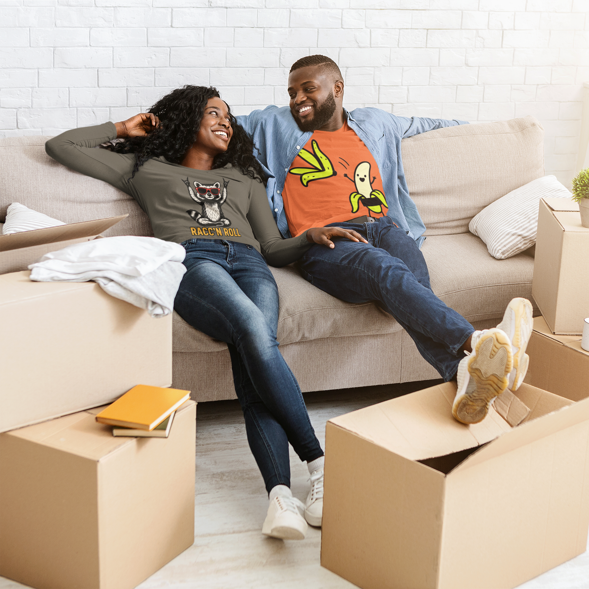 This graphic tee plays with playful confidence and visual humor, featuring a smiling banana character mid-peel while the peel itself flies off like it’s been launched with attitude. The contrast between the bright neon yellow and deep black background makes the artwork pop instantly, giving it a mischievous, high-energy presence without saying a single word. It’s cheeky, bold, and self-aware—confidence expressed through movement and timing rather than shock value. This design doesn’t ask for attention; it naturally steals it through clean lines, cartoon charisma, and controlled chaos. Comfortable enough for everyday wear yet loud enough to stand out, it fits perfectly into a gym-to-street lifestyle where humor and confidence go hand in hand. Pair it with jeans, cargos, joggers, or throw it under a hoodie or jacket for an effortless streetwear look that doesn’t take itself too seriously. This tee is for people who move light, smile first, and still own the room.